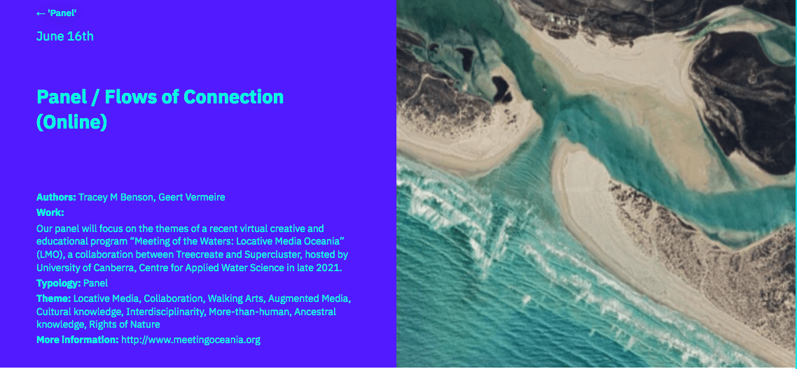 It was fantastic to get The Meeting of the Waters : Locative Media Oceania at the recent 27th International Symposium on Electronic Art (ISEA) in Barcelona. The project was discussed at a panel conversation between our founder Tracey and Treecreate partner, Geert Vermeire with video editing from Fred Adam, from Supercluster. It was great toContinue reading “Treecreate and Supercluster at ISEA Barcelona”